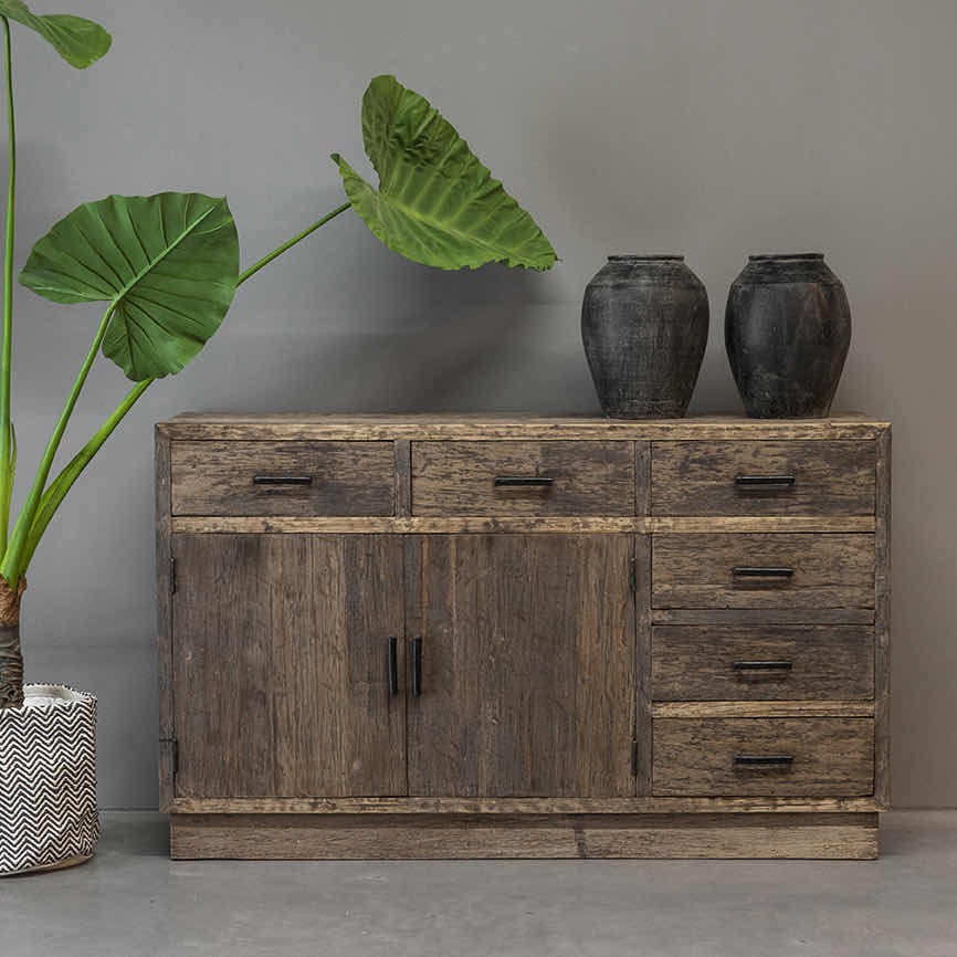 Dit dressoir is gemaakt van origineel oud hout. Het grove en oude hout is decennia lang intensief gebruikt als laadvloeren van Indiase trucks. Hierdoor heeft het hout een uiterst doorleefde maar unieke uitstraling gekregen.