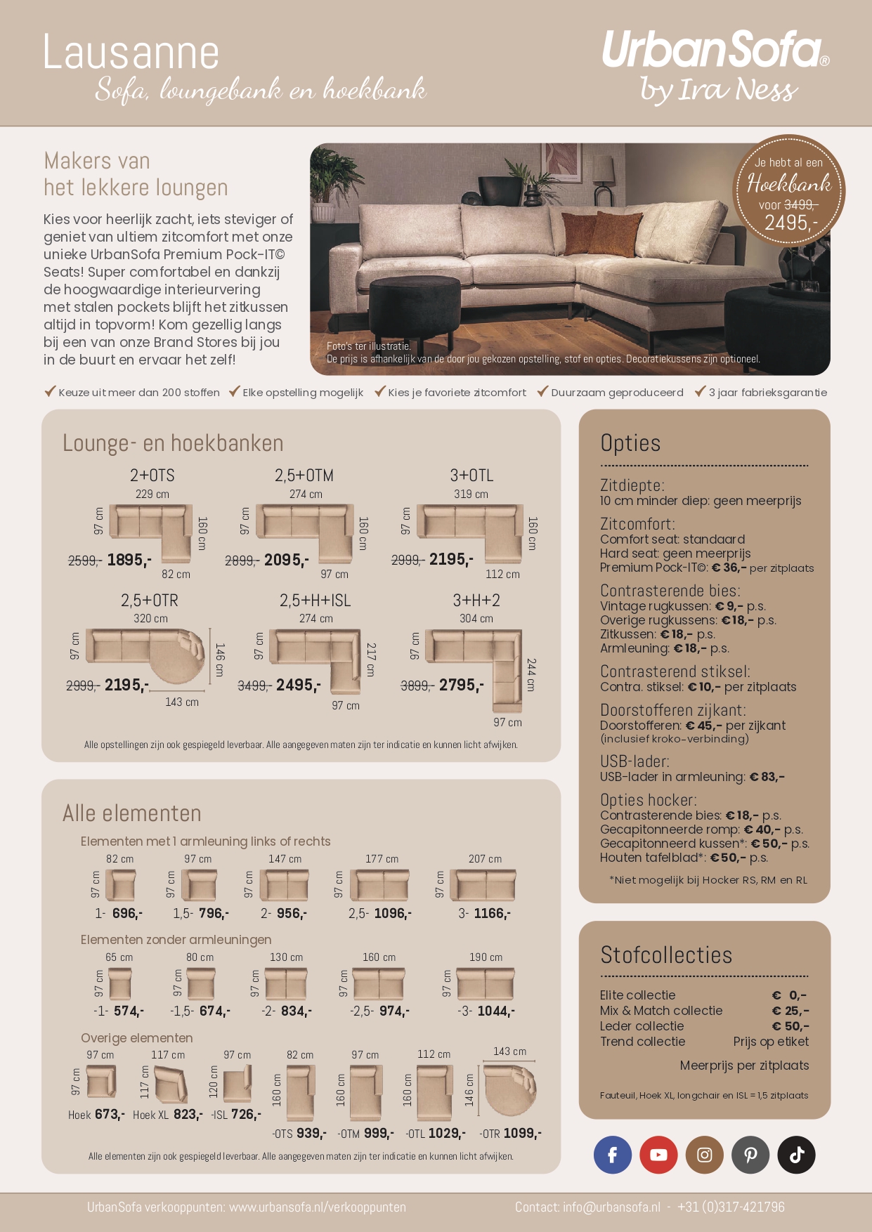 Kies uit de talloze opstellingen, uit de twee zitdieptes, verschillende vullingen en uit meer dan 200+ stoffen en leder. Kijk voor alle informatie op de Lausanne product flyer.