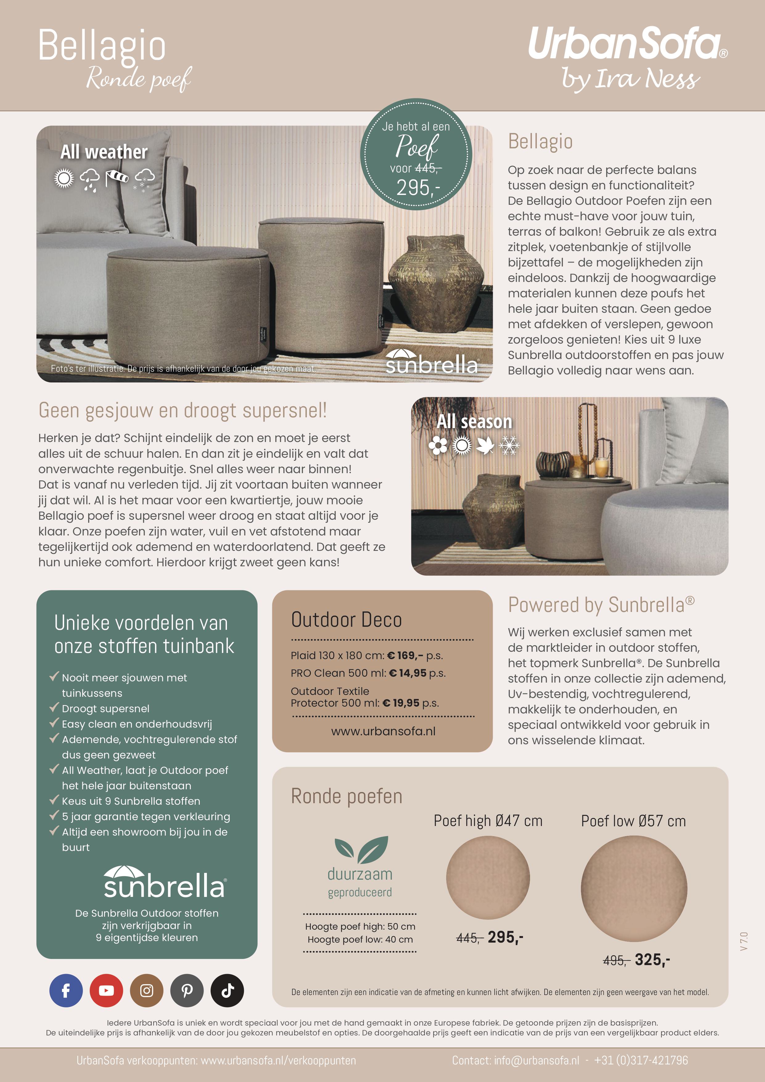 Dankzij de hoogwaardige materialen kunnen deze poufs het hele jaar buiten staan. Geen gedoe met afdekken of verslepen, gewoon zorgeloos genieten! Kies uit 9 luxe Sunbrella outdoorstoffen en pas jouw Bellagio volledig naar wens aan.
