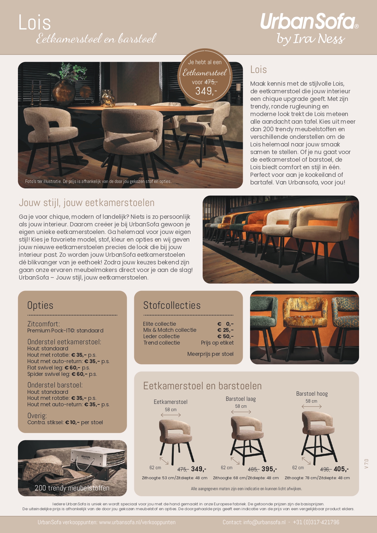Kies uit meer dan 200 trendy meubelstoffen en verschillende onderstellen om de Lois helemaal naar jouw smaak samen te stellen. Of je nu gaat voor de eetkamerstoel of barstoel, de Lois biedt comfort en stijl in één.