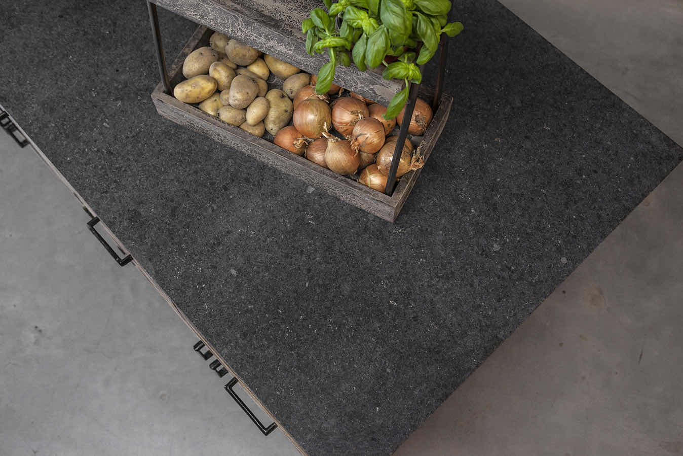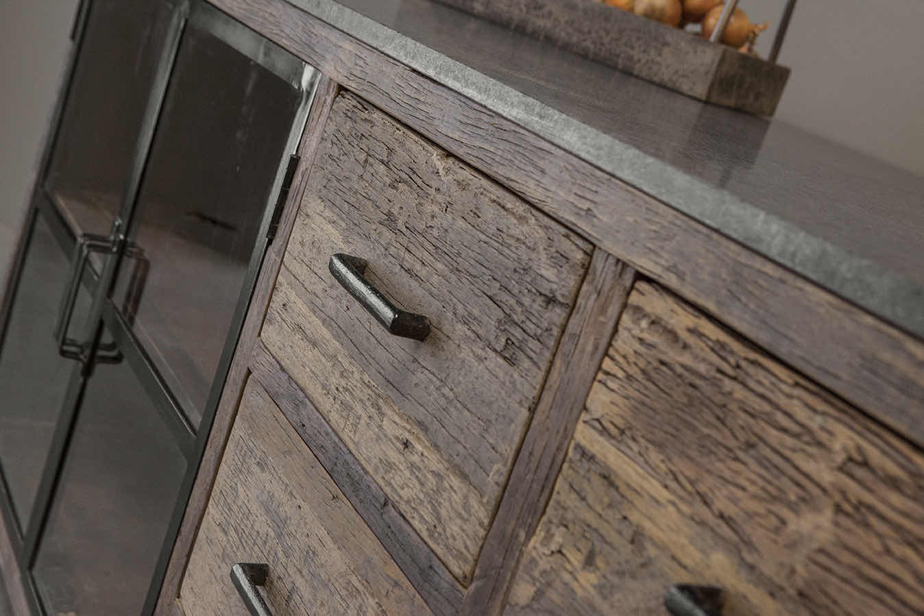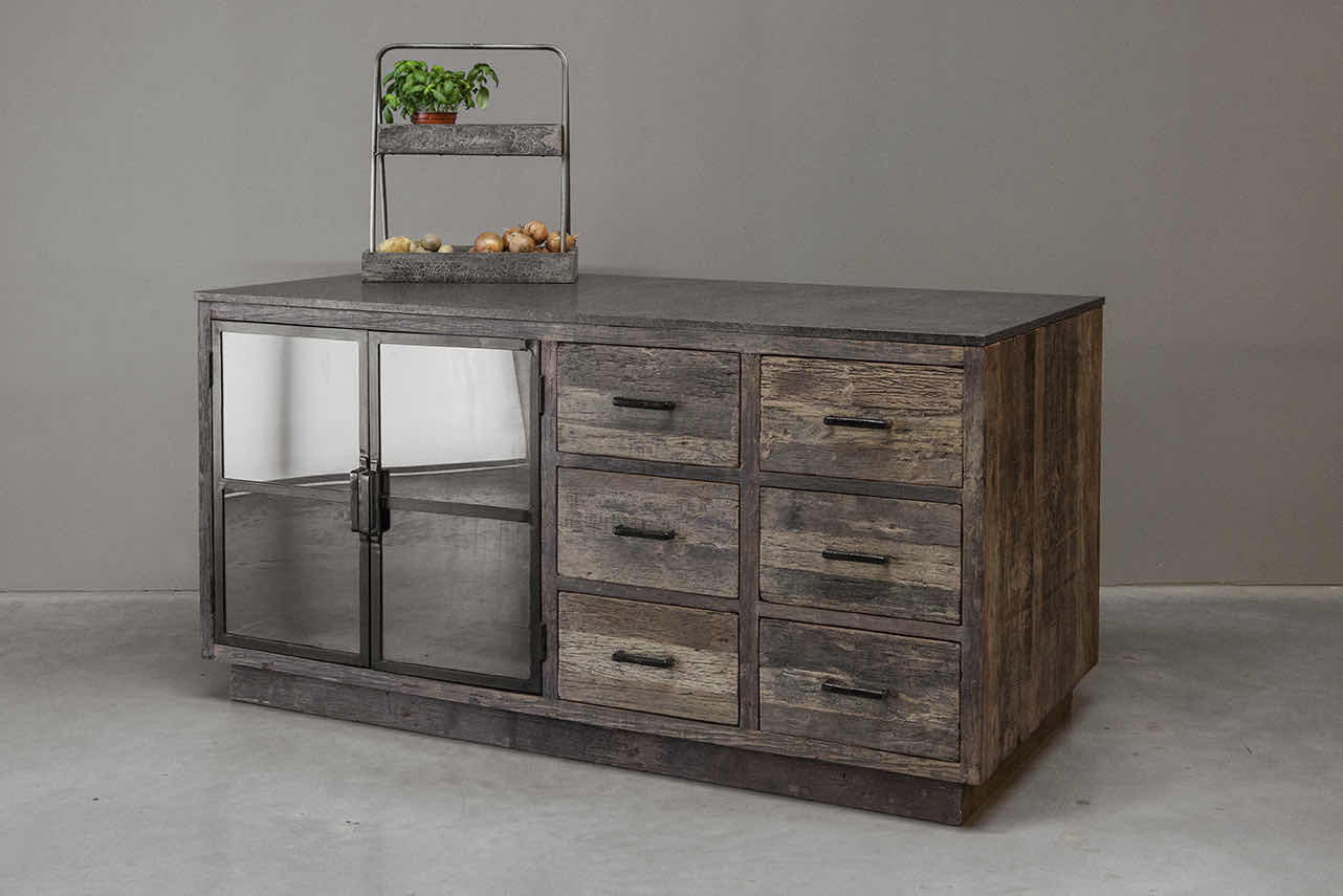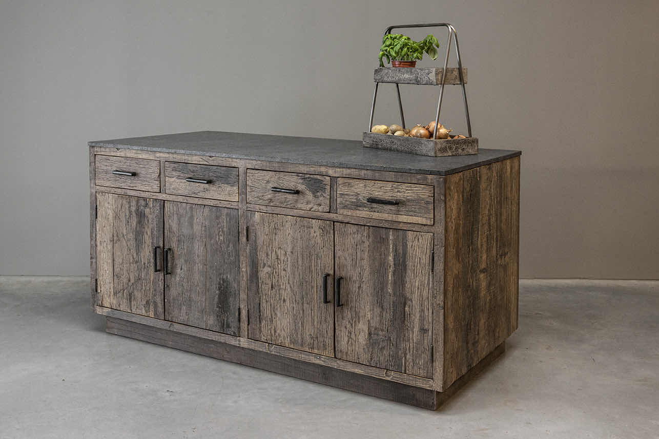 Het kookeiland is compleet gemaakt van oud rustiek hout inclusief granieten werkblad.