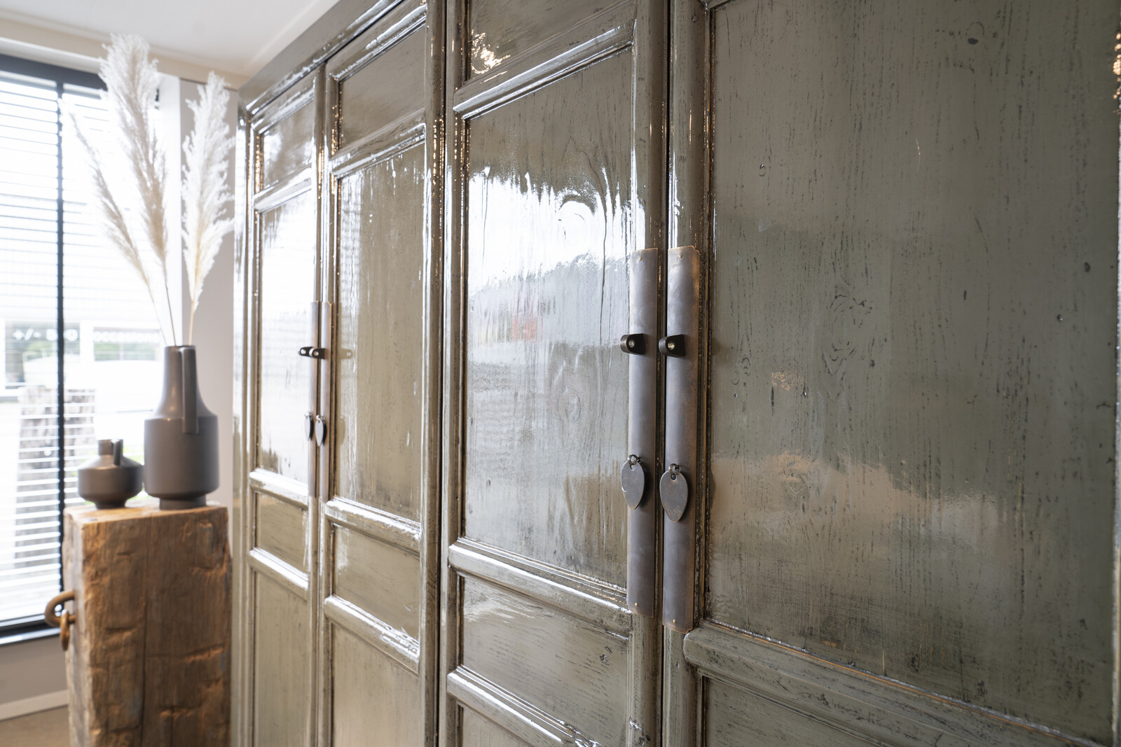 De Oriëntaalse kast Gijs in grijsgroen heeft 4 deurtjes en 3 legplanken aan de binnenkant van de kast.