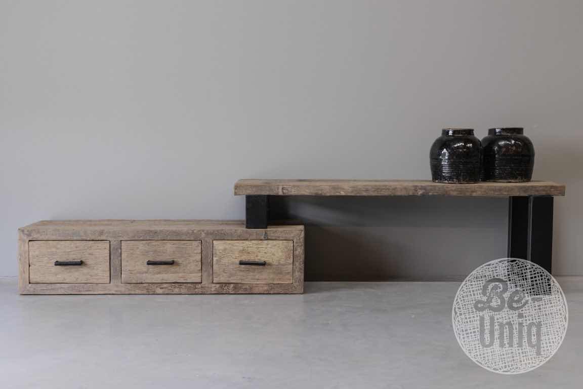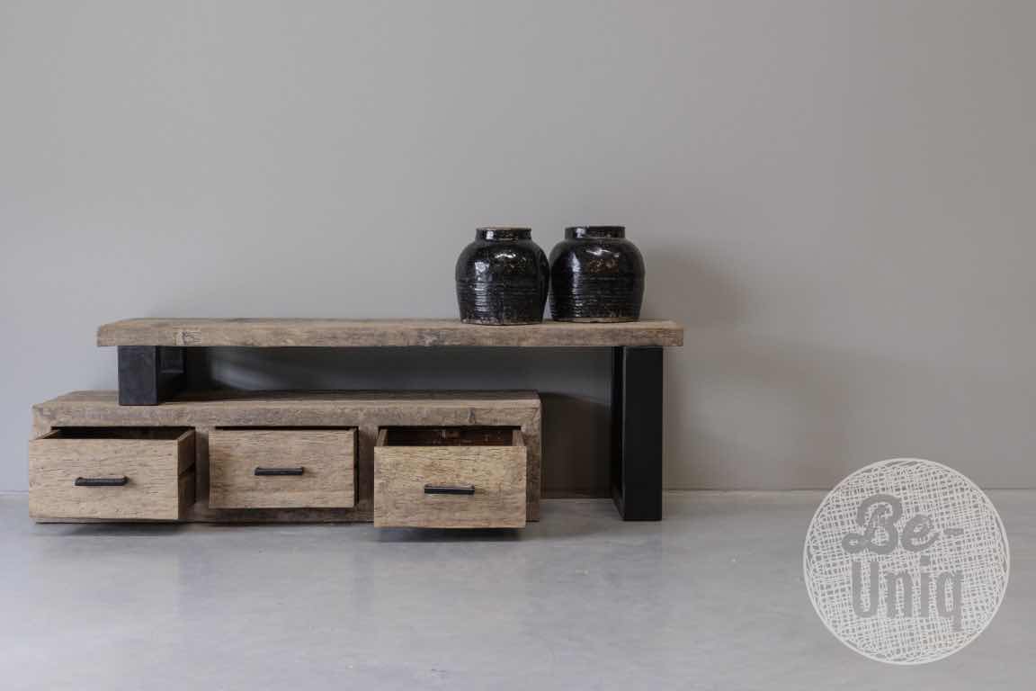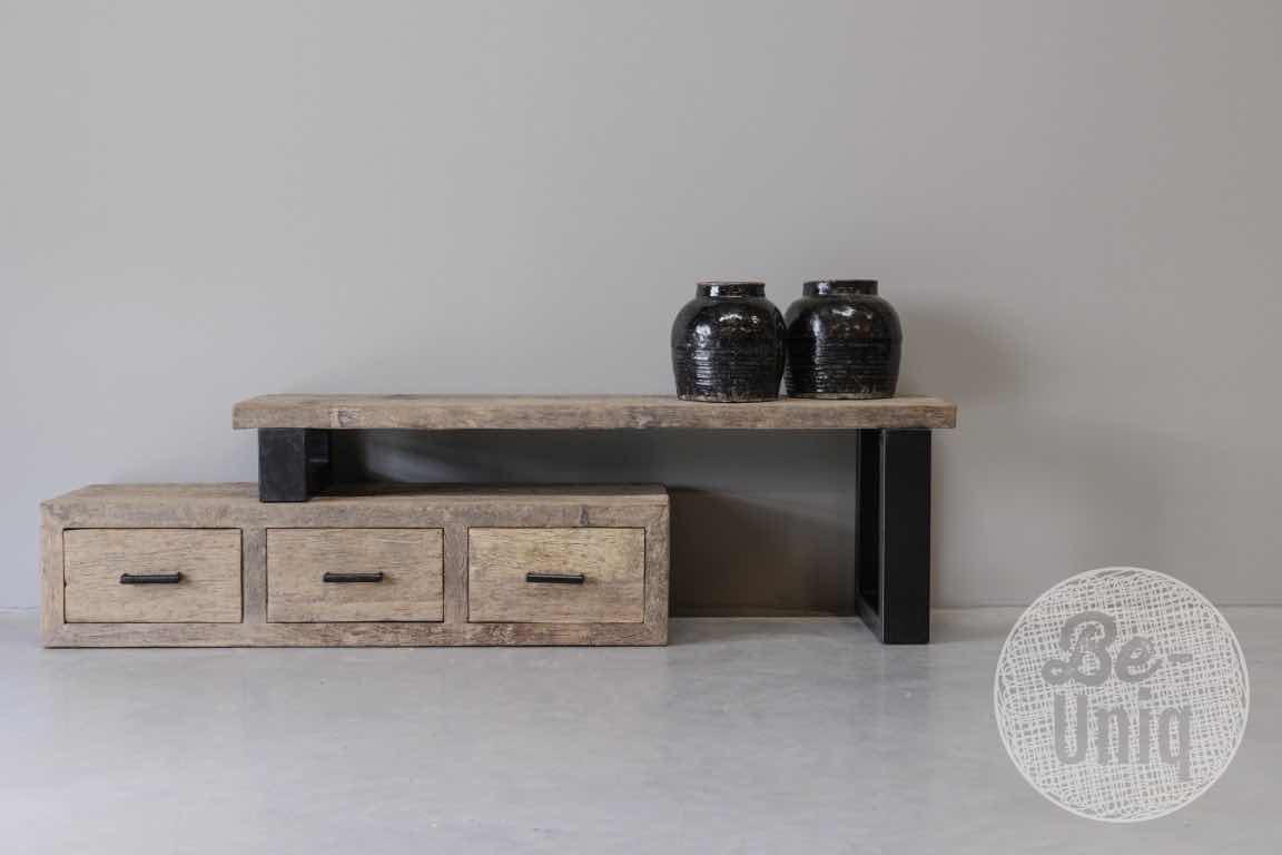 Dit tv-meubel bestaat uit 2 losse delen (onderkast en bovenrek) die naar wens over elkaar geschoven worden.